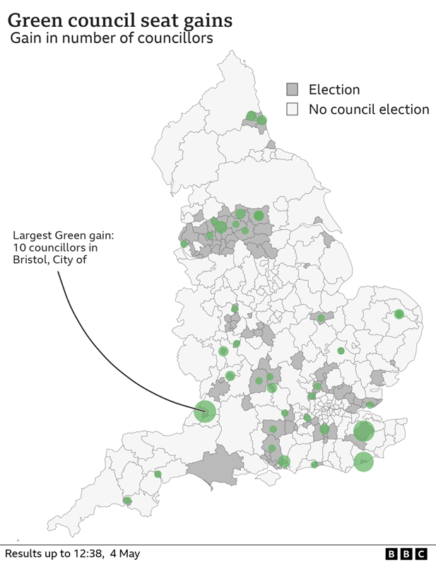Greens candidates invariably offer practical policies to address local issues and, as can be observed on this electoral map from the BBC, this election has seen some interesting breakthroughs with seats won from both Labour and Conservative parties in South Tyneside, Exeter, Peterborough and Colchester.